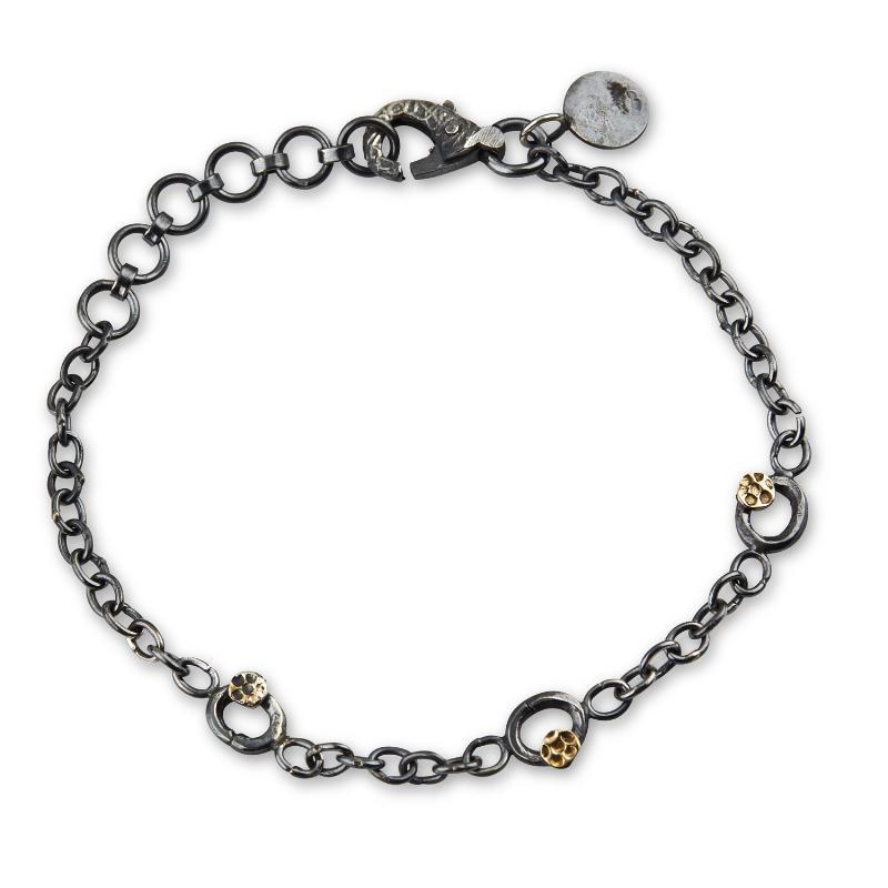Armbåndet er fremstillet i sterling sølv, som giver en strålende base for de unikke hamrede guldplader i 14 kt guld. Den perfekte kombination af sølv og guld skaber et visuelt spil, der fanger øjet og tilføjer et strejf af luksus til enhver påklædning. Det enkle og feminine design gør det ideelt til både hverdagens outfits og festlige lejligheder.