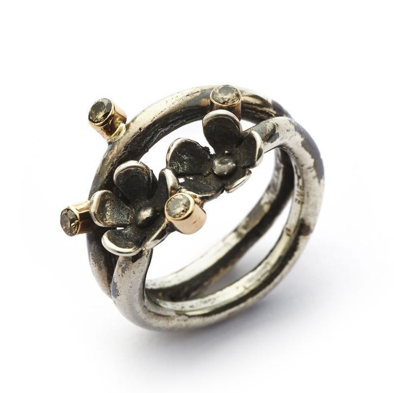 Designet i By Birdies kollektion Universe, fanger denne ring blikket med sit unikke design bestående af to delikate blomster. Hver blomst er prydet med fire brillantskårede diamanter, der tilsammen vejer 0,20 ct. Disse funklende diamanter tilføjer et strejf af glamour og lys til ringen, hvilket gør den perfekt til både hverdagens begivenheder og særlige anledninger.
