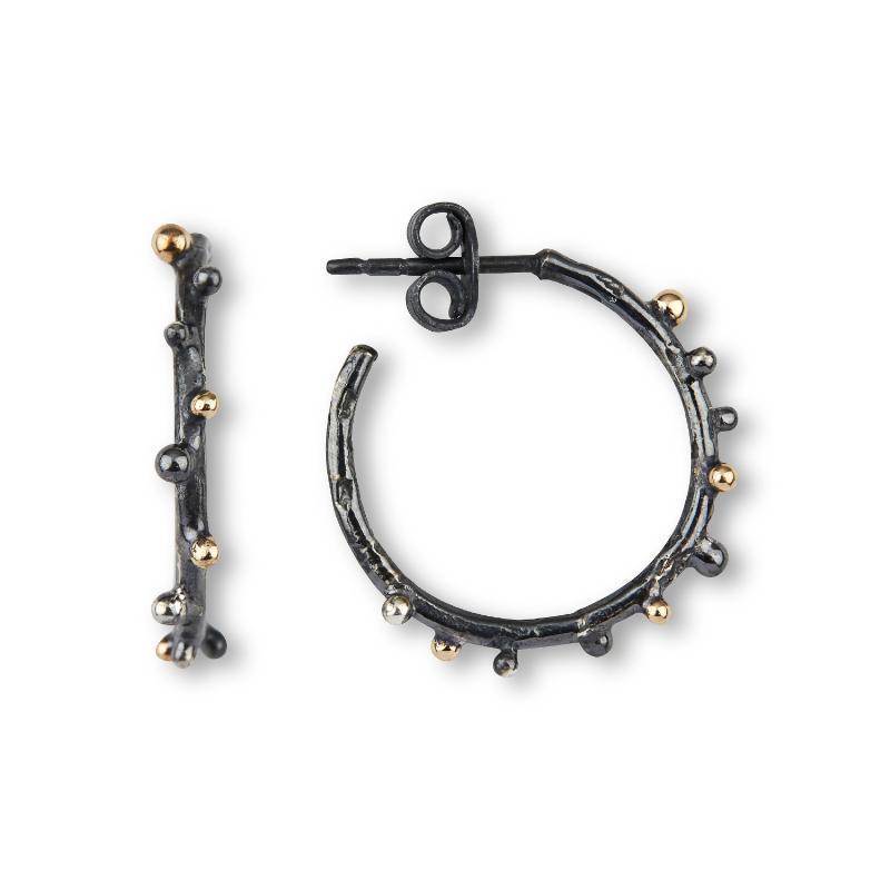 Øreringene er prydet med små bolde i 14 karat guld og sølv, som skaber en smuk kontrast mod det mørke sølv. Denne kombination af materialer giver et unikt spil mellem lys og skygge, der fanger blikket og tiltrækker beundring fra alle omkring dig. Uanset om du skal på arbejde, til fest eller blot ønsker at forkæle dig selv, vil disse øreringe være det ideelle accessory.
