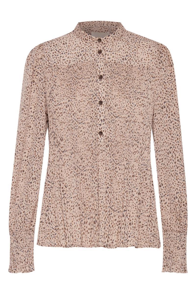 Skjorten præsenterer et smukt grafisk print i varme brune og delikate rosa nuancer, der giver et friskt og feminint udtryk. Den runde halsudskæring er både elegant og praktisk, da den lukkes med knapper ned til livet, hvilket gør skjorten ammevenlig. Det betyder, at du kan se fantastisk ud, samtidig med at du får den funktionalitet, du har brug for i din hverdag.
