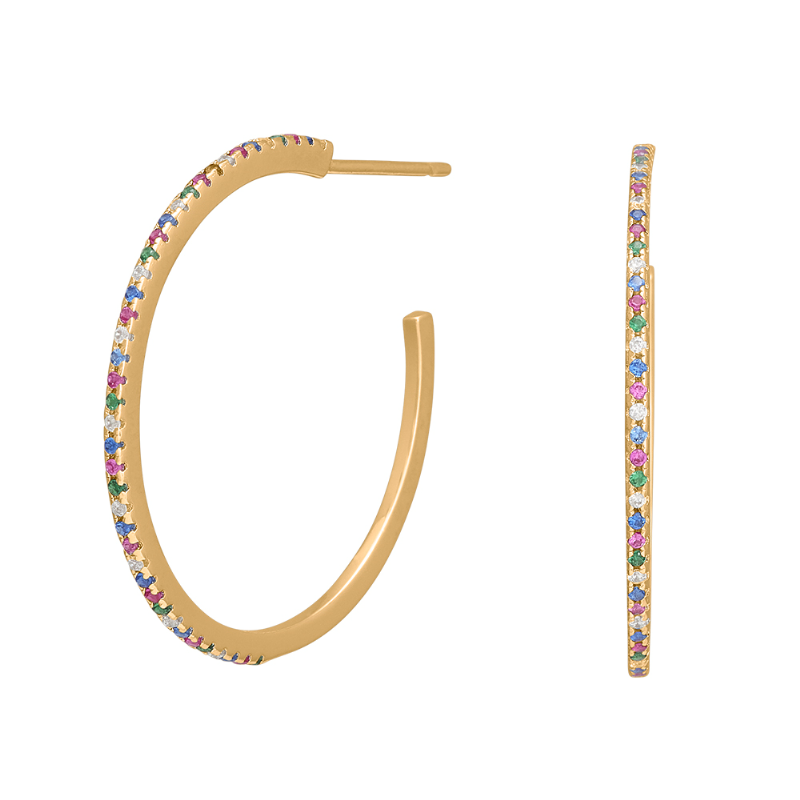 Disse forgyldte creoler er fremstillet af høj kvalitet sølv, der giver dem en luksuriøs glans og holdbarhed. Den guldplaterede overflade tilfører et tidløst touch, mens de farverige zirkonia-stene skaber liv og personlighed. Hver enkelt sten er omhyggeligt udvalgt for at sikre, at de stråler af skønhed og elegance. De mange farver i stenene giver dig mulighed for at matche dem med dit outfit eller din humør – uanset om du ønsker et subtilt look eller noget mere dristigt.