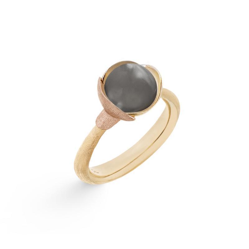 Ringen er udført i luksuriøst rødguld 750/- og prydes af delikate blade i rosaguld 750/-, hvilket giver et fantastisk spil af farver og glans. Det ædle metal kombineret med den smukke grå månesten cabochon skaber et unikt udtryk, der fanger blikket og tiltrækker beundrende kommentarer.