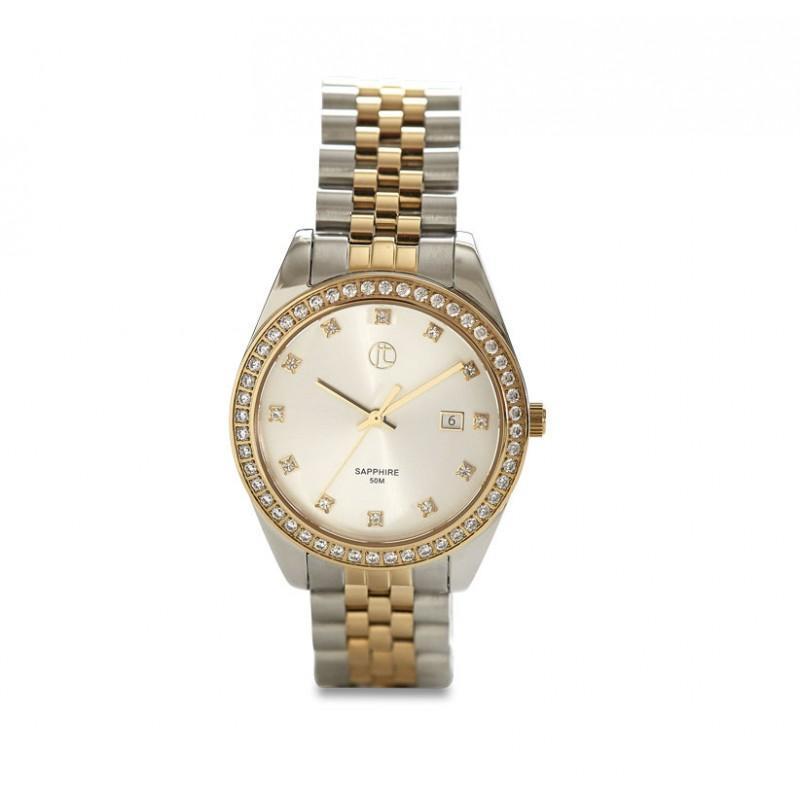 Uret er fremstillet i bicolor stål, hvilket giver det en sofistikeret og klassisk fremtoning. Den smukke urskive i stålfarve står i kontrast til den glitrende krans af zirkonia, der omkranser urets ansigt. Disse glitrende sten fanger lyset på en måde, der gør uret til et sandt blikfang – perfekt til både hverdag og festlige anledninger.